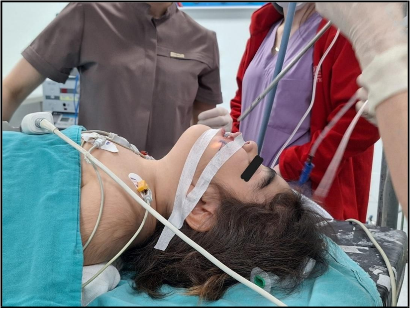 An eight-year-old girl was brought to the emergency department with acute onset noisy breathing and stridor. On arrival, she was hypoxemic with SpO₂ of 86%, despite receiving 6 L/min of oxygen via nasal cannula. A chest radiograph confirmed the presence of a foreign body lodged in the trachea. The patient had a known diagnosis of MPS IIIA, with a history of delayed neurocognitive development. Physical examination revealed coarse facial features, macroglossia, short neck, and craniofacial dysmorphism, all suggestive of a difficult airway scenario (Figure 1). Emergency rigid bronchoscopy was indicated for removal of the foreign body. Standard American Society of Anesthesiologists monitoring was instituted in the operating room. Due the high risk of airway difficulty, a video laryngoscope, endotracheal tubes of various sizes, supraglottic airway devices including laryngeal mask airway (LMA), and a rigid bronchoscope were prepared and checked prior to induction. Preoxygenation was performed for three minutes with 100% oxygen. Anesthesia was induced with propofol 2 mg/kg, rocuronium 0.6 mg/kg, and fentanyl 1 μg/kg. Anesthesia was maintained with a continuous infusion of propofol.
