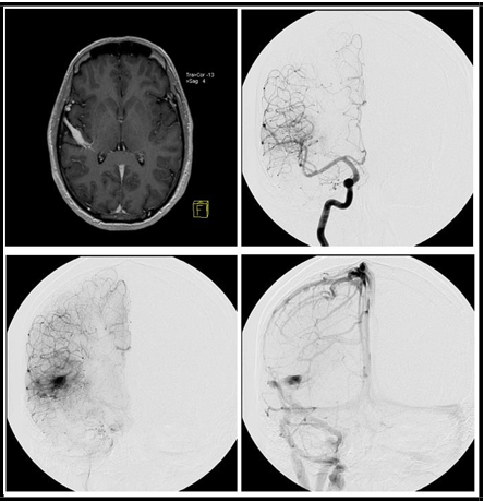 Three patients presented on this series were seen in the clinic for different reasons: One 50 years- old man was investigating recent onset of seizures, another woman aged 45 had an incidental finding during the investigation of a headache and the last one was a young woman (age 28) studied with DSA during the procedure of stereotactic radiosurgery after an episode of intracerebral hemorrhage attributed to a vascular abnormality seen on a DSA’s arterial phase. The first 2 patients were not treated for the vascular abnormality. The images seen on MR and DSA are presented in Figures 1 to 3.