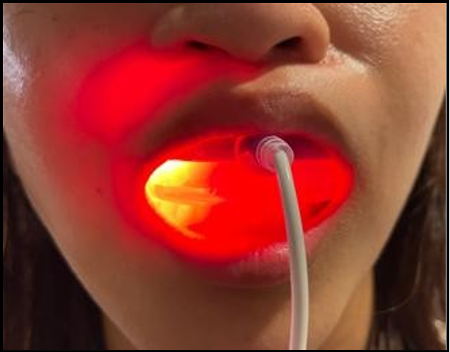 Figure 10: Intraoral use of the PBM Implant with illumination of the soft tissues by red light.