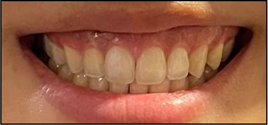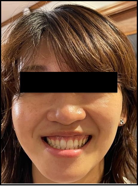 There was a bilateral open bite. The patient was first treated with aligners to correct the tooth and jaw discrepancy, but this was not successful, therefore she elected to have jaw surgery as well as pre surgical fixed orthodontics to finalize the detailing of the teeth positioning for surgical repositioning. (Figure4)