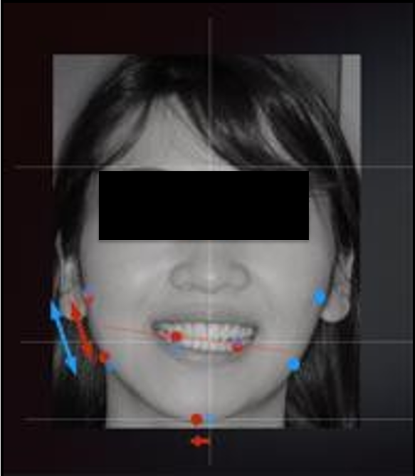 A 17 -year-old female patient reported for orthodontic treatment as a prelude to jaw surgery to correct a lower jaw asymmetry. There was a chief complaint of asymmetric jaw relationship and in addition irregular teeth position, jaw clicking and an unesthetic smile due to the crooked jaw. (Figure 2 and 3)