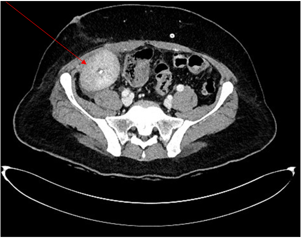 Figure 1: Contrast-enhanced abdominal CT showing heterogeneous peripheral cortical enhancement of the renal allograft, consistent with an inflammatory or infectious process