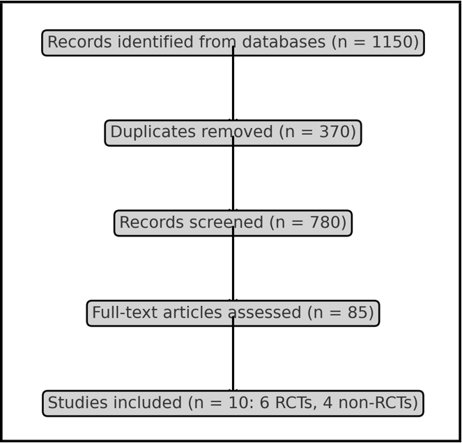 This review followed PRISMA (Preferred Reporting Items for Systematic Reviews and Meta-Analyses) 2020 guidelines and was registered on OSF. Databases searched: PubMed, Embase, Scopus, Web of Science, Cochrane CENTRAL, ClinicalTrials.gov, WHO ICTRP, and grey literature (ProQuest) to 28 October 2025. Eligibility (PICOS): Population—patients with fixed appliances; Intervention— adjunctive vibration (LFV or HFV); Comparator—sham/no vibration; Outcomes—OTM, pain, adverse events; Design—RCTs (randomized controlled trials) or controlled nonrandomized studies. Risk of bias was assessed with RoB 2 (RCTs) and ROBINS-I (nonrandomized). Meta-analysis was planned but not feasible due to heterogeneity. Heterogeneity was assessed qualitatively based on variations in study designs, vibration frequencies, daily usage times, and outcome measurement methods. Quantitative assessment using I² was not performed as pooling was not feasible. A PRISMA flow diagram is shown in Figure 1.
