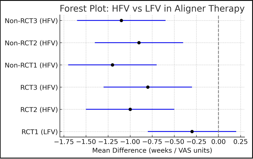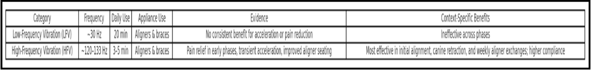 Translational Implications HFV provides early-phase benefits: (1) pain relief during the first 48–72 hours after archwire placement, (2) transient acceleration during canine retraction, and (3) improved seating/compliance with short daily use. These benefits suggest HFV may be most valuable during early alignment and space closure phases, rather than throughout full treatment. HFV could realistically alter treatment planning by allowing more frequent archwire changes or aligner advancements in early phases, potentially improving patient adherence through reduced pain and shorter daily use times, particularly in patients with low pain tolerance or compliance issues. Evidence remains inconsistent, requiring larger RCTs.