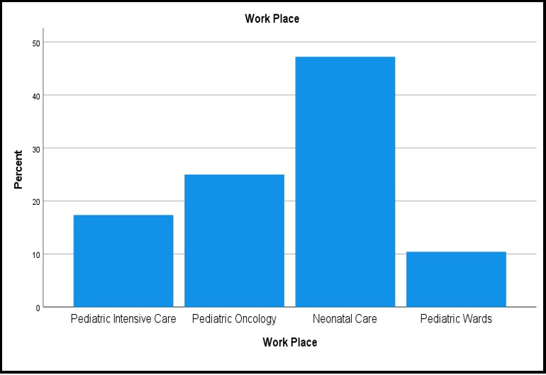 This survey focused on 142 paediatric nurses and examined various aspects of their professional lives. The participants had varying ages, as indicated in: Table 01, with 42 % being between 30 and 40 years old and 22 % being over 40. Ethnicity-wise, 60 % of the participants were Asian, while 35 % were of Arabic origin. Over 50 % of the participants were married, and 41 % were single. In terms of work experience, Figure 01 shows that 36 % of the participants had more than 10 years of experience, while 22 % had between 4 and 6 years of experience. Moreover, Figure 04 shows that the majority of the participants (60 %) worked in the paediatric and oncology ward, while 19 % worked in the paediatric ICU, and the percentage of working fours presented in Table 02 and Figure 02 showed that the participants generally had a 12-hour shift, with 95 % of the respondents reporting this.