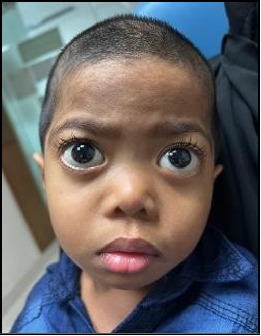 Baby X, a 6-year-old girl, 1st issue of non-consanguineous parents with an upper-middle-class background, visited the OPD of the Bangladesh Eye Hospital, Dhaka with her parents and presented with complaints of decreased vision along with speech delay and hearing impairment. She was diagnosed with a cataract in her left eye. However, the characteristic facial dysmorphism (bilateral exophthalmos, flat face, low-set ears, micrognathia) and associated complaints produced some doubt in the ophthalmologist and he arranged for further clinical evaluation. History showed that her birth was term and uncomplicated, and motor development was age- appropriate. She just started schooling and the issue of low vision was detected by her teacher.
