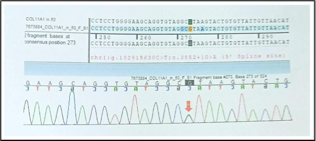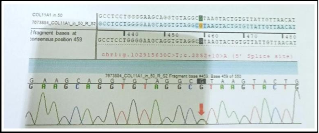 Sequence chromatogram and alignment to the reference sequence showed that the variant in intron 50 of the COL11A1 gene [chr1: g,102915630C>T;c.3852+1G>A (5’ splice site)] was detected in heterozygous condition in the Fetus Z with set 1 primer (Baby X) and set 2 primer (Baby Y).