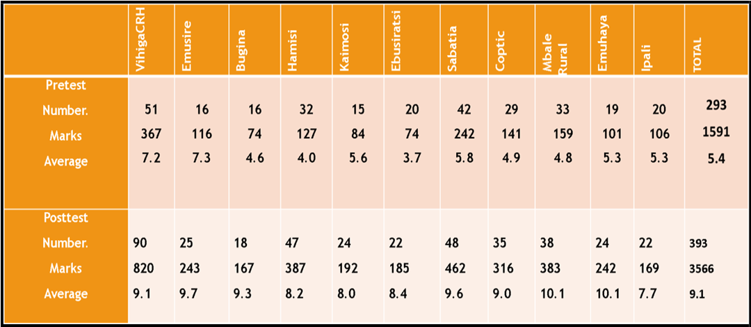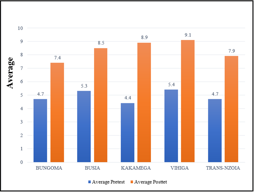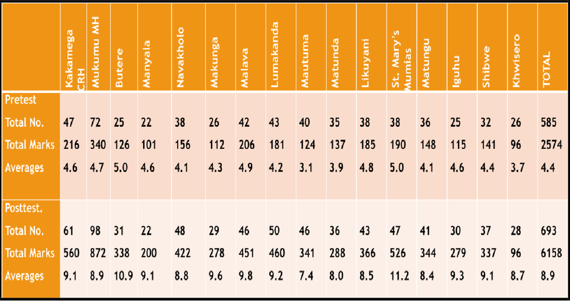 The study team assessed the level of knowledge on SCD of various cadres of staff (Doctors, Clinical Officers, Nursing officers, Public Health Officers, Nutritionists and etc.) in the 5 different counties. The HCPs were exposed initially to a Pre-test, a Continuous Medical Education (CME) session and then a Post-test. The average score of Pre-test done by 2118 HCPs was 4.6 (maximum 15) while the average score of the Post-test done by 2670 HCPs was 8.3 (maximum 15). The positive trends in improvement in knowledge call for further efforts in dissemination of the required information on SCD through various forums.