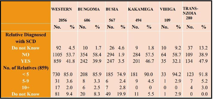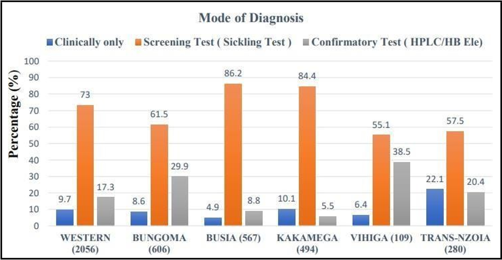 In Kenya, most of the cases are found in Western, Nyanza, Coast, Nairobi and parts of Eastern regions or provinces. [4, 5] Aluoch J. R. et al in 1993 documented that more than 80% of patients with sickle cell anaemia were of Luo and Luhya origin with Sickle Cell Trait (SCT) rate of 28% among them while among the Kamba and Mijikenda, the SCT rate is about 35%. [5] Kuta E et al in 2016 documented the prevalence of SCD of 3.2% and SCT of 13.2% among newborns in Kisumu while Watenga et al in 2017 found the prevalence of SCT of 18.7 % among adolescents in Bungoma county, Kenya. [6, 7]