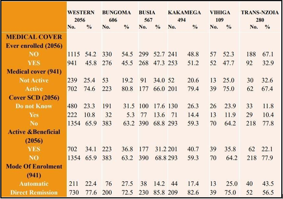 This study registered a total of 2056 PLWSCD out which 1745(84.9%) of were aged less than 18 years and therefore dependent on their parents or guardians while only 23 (1.1%) were aged more than 45 years. Those who indicated that they knew of some relative(s) with SCD were 859(41.8%). Regarding the diagnostic work up, only 357(17.3%) had a confirmatory test (HB Electrophoresis/ HPLC) while majority 1500 (73.0%) had a screening test (sickling test) done. Most of the PLWSCD reported having had multiple hospital admissions and multiple blood transfusions. The families of PLWSCD who had ever enrolled in a medical cover were 941 (45.8%) with majority 730(77.6%) of them paying the premiums by direct remission in to the fund, however only 34.1% (702 out of 2056) had an active and beneficial medical cover with only 30.8% (633) PLWSCD being able to access and afford hydroxyurea. These findings call for establishment of SCD registries (PLWSCD, Haemoglobin Variants, Organizations that deal with SCD) and strengthening of specialized clinics by ensuring that medications, supplies, reagents and equipment are available, accessible and affordable so that the communities are able to receive the services required for the control of SCD. To make the services affordable, all families including those of PLWSCD should be encouraged, guided and supported to purchase a medical insurance cover. The health care leadership and other stakeholders need also to lobby for an, ‘essential package’ from the existing Health Insurance Fund for PLWSCD. As an appropriate way forward towards the realization of a SCD registries and Control Programme (SCDRCP), the study team has designed various tools to assist collect standardized information which can be analyzed and used for intervention projects.